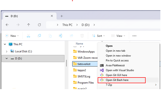 Käynnistetään Git Bash: Windowsin tiedostonhallinnassa klikkaa oikealla napilla haluttua kansiota ja valitse Open Git Bash Here --> Git Bash komentorivi aukeaa niin että polku on automaattisesti halutussa kansiossa.