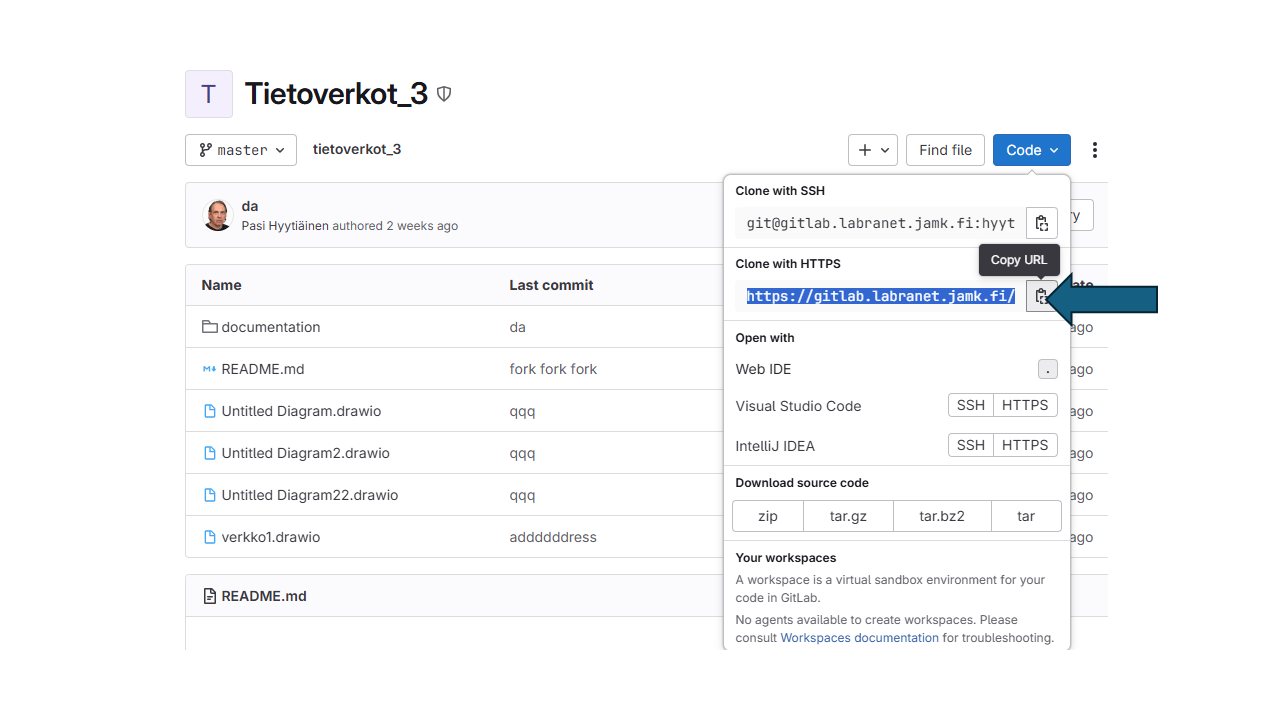 Kloonaa (engl. clone) gitlab-palvelimelta repo omalle koneellesi. Tee se vain kerran. Kommitoit jatkossa tehtäväsi ensin paikalliseen repoosi, josta ne aika-ajoin pushataan gitlabin repoon. Sinulla täytyy olla Labranetin tunnukset, jotta voit kloonata repon.