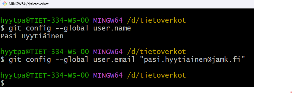 Huom: Ole tarkkana että annat ne oikein, sillä git ei anna toista mahdollisuutta!