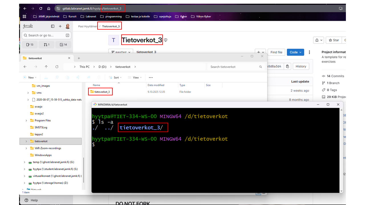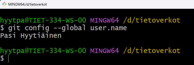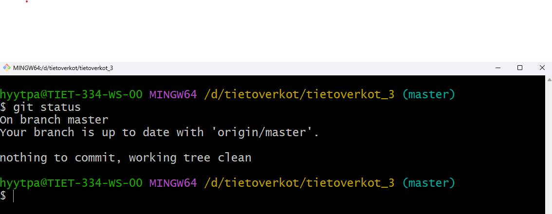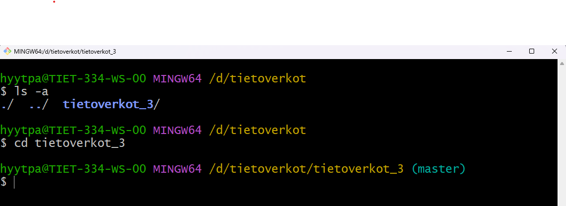 Kun haluan työskennellä oman repon Tietoverkot_3 kanssa omalla koneeella, on syytä huolehtia, että git bash on oikeassa hakemistossa.