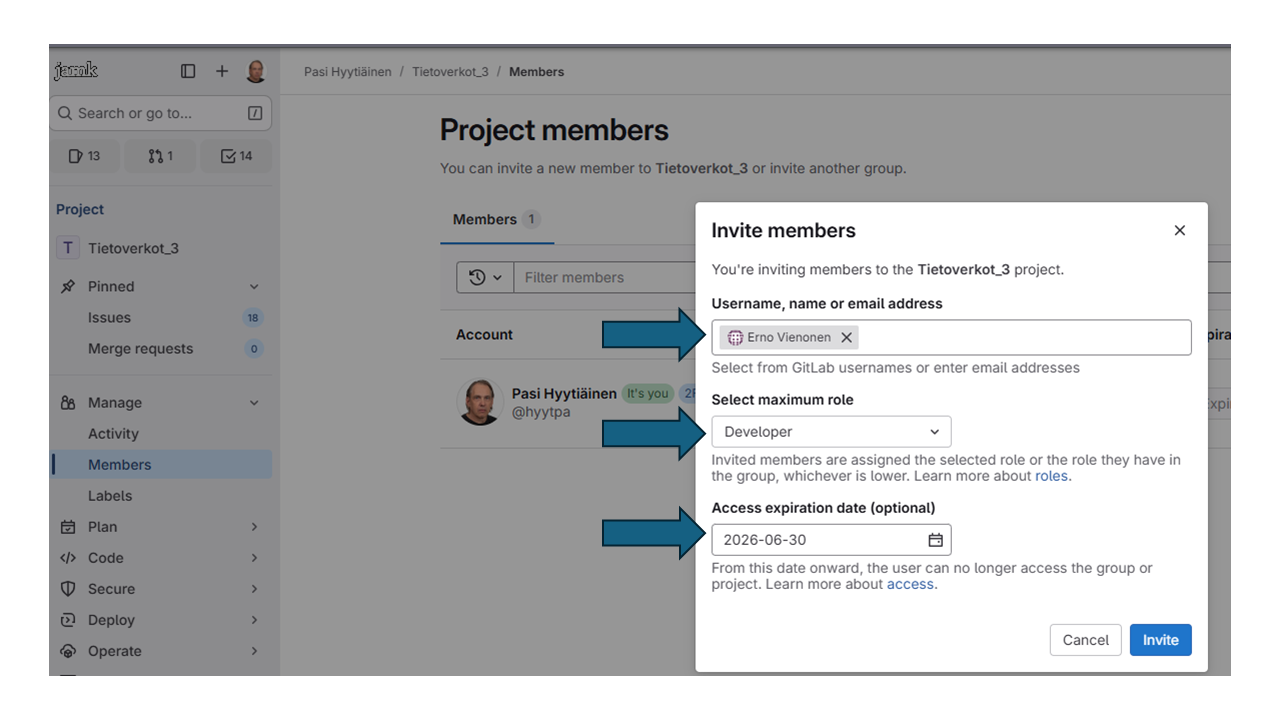 2. Kirjoita sinun opettajasi nimi kohtaan gitlab member or Email address