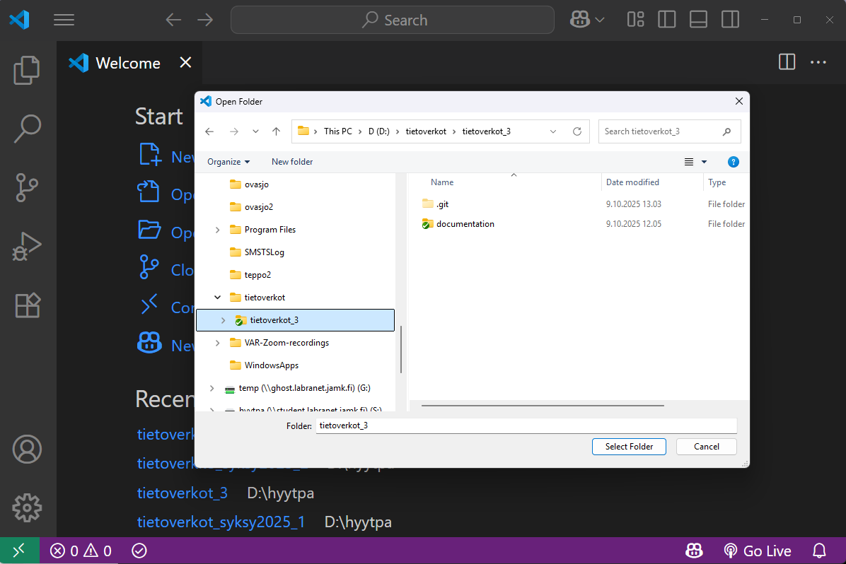 Kun haluan työskennellä Visual Studio Coden kanssa, on syytä kiinnittää Visual Studion juurihakemisto myös samaan Tietoverkot_3 hakemistoon.